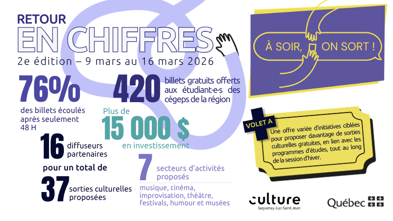 Du 9 au 16 mars 2026, les étudiant·e·s des cégeps du Saguenay–Lac-Saint-Jean pouvaient soumettre une demande en ligne pour obtenir un billet ou une paire de billets gratuits, leur donnant accès à une programmation originale, diversifiée, divertissante, surprenante et hautement stimulante, proposée par les diffuseurs partenaires.